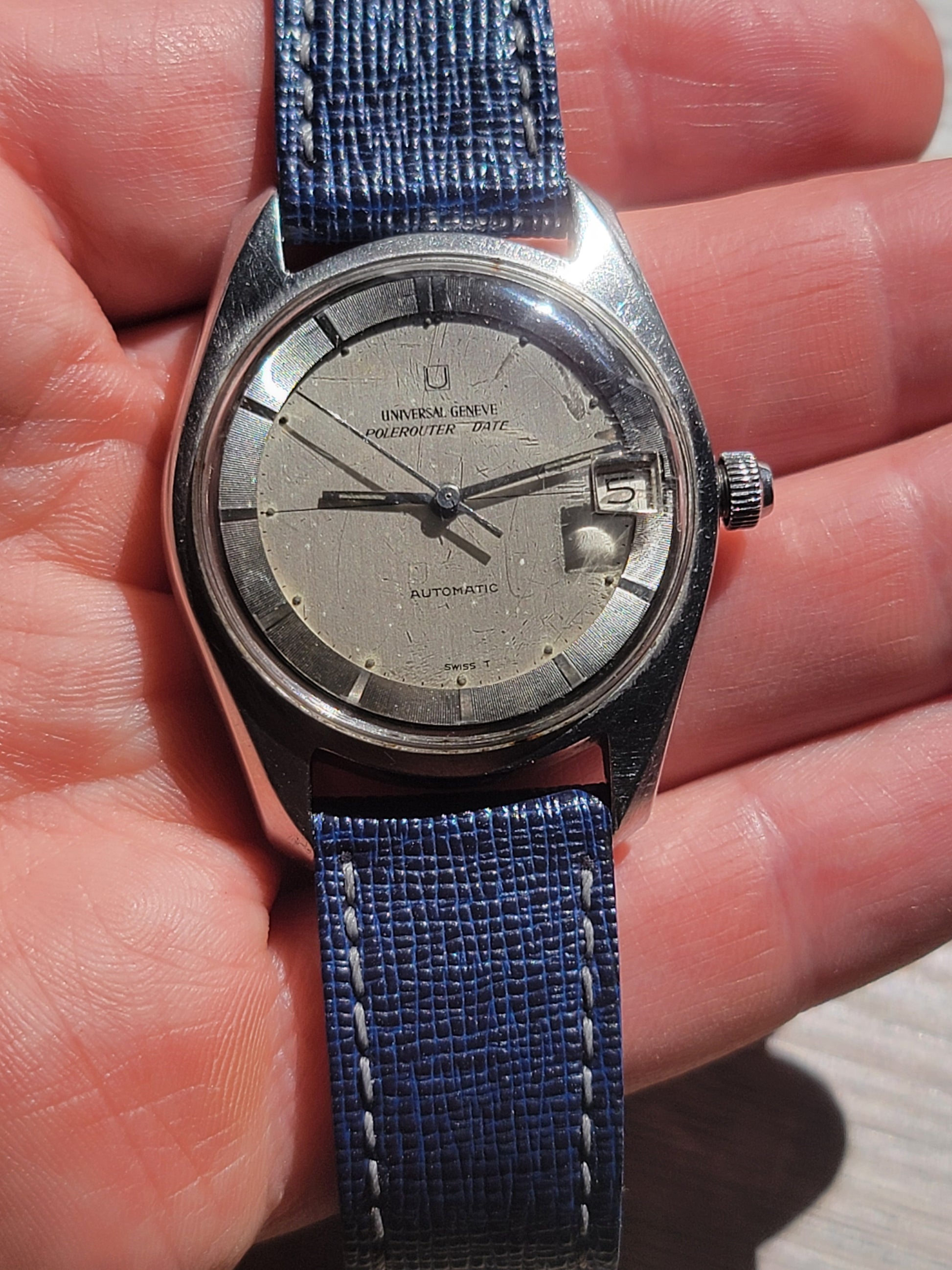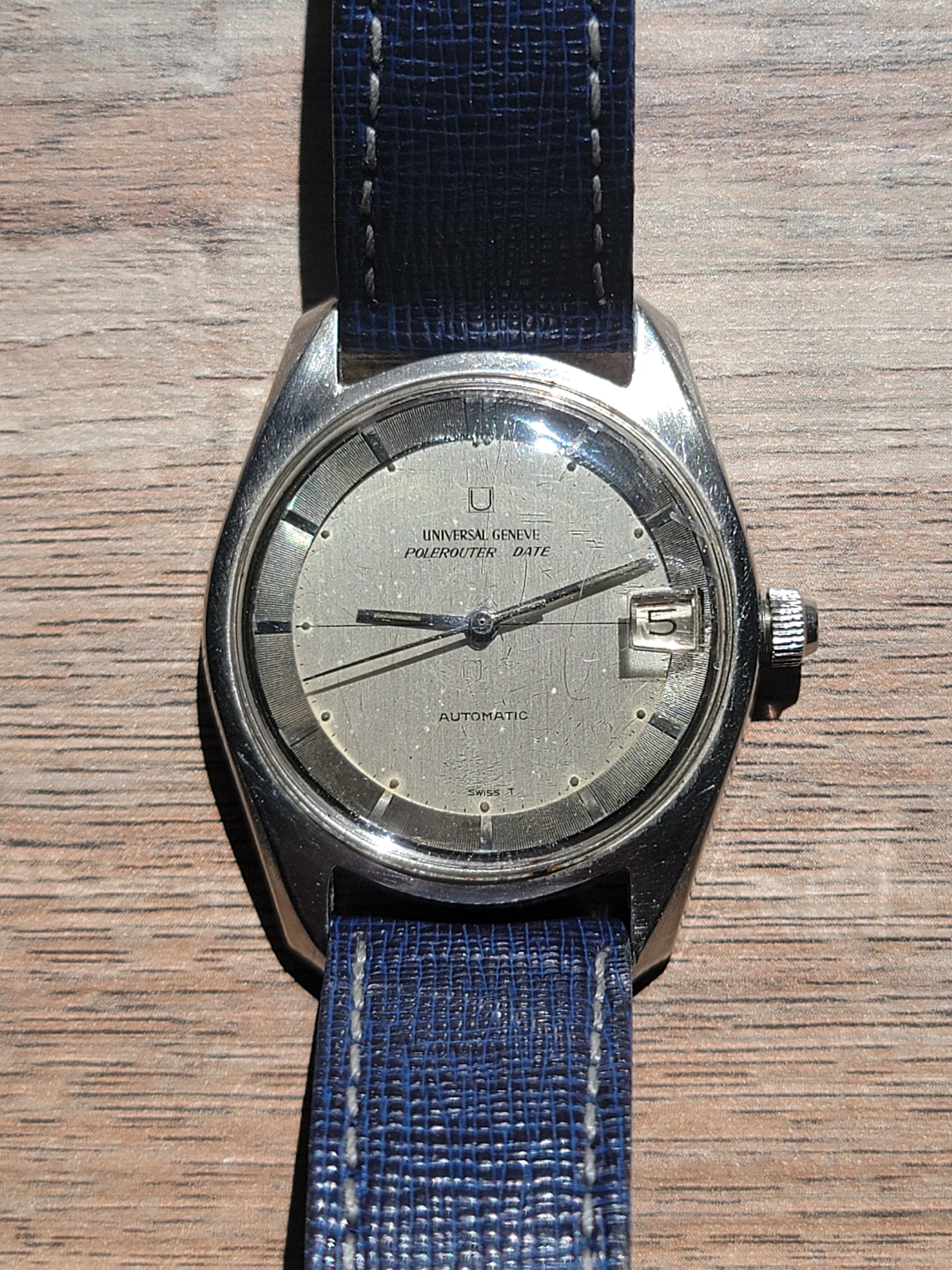 This vintage, all original Universal Geneve Polerouter Date features a stunning silver dial and traditional squared off lugs, unlike it's more well known cousin with the twisted lyre lug design. Unlike the dauphine hands on many polerouters, this example has stick hands with a small stepped crown. The case is in fantastic condition for it's age and the silver dial shows no major blemishes or heavy aging. The dial in some lights has a creamy golden color with some minor blemishes when looked up close. The dial contains a horizontal line dissecting the dial in half and features a beautiful trapezoidal date window with a matching trapezoid shaped cyclops on the crystal. It is becoming harder to find these models with their original trapezoidal cyclops acrylic crystal which helps to really showcase the beautiful UG font used for their dates. The movement is micro rotor UG caliber 69 which has been recently serviced and keeping accurate time. The watch comes on a blue saffiano leather strap from Those Watch Guys.