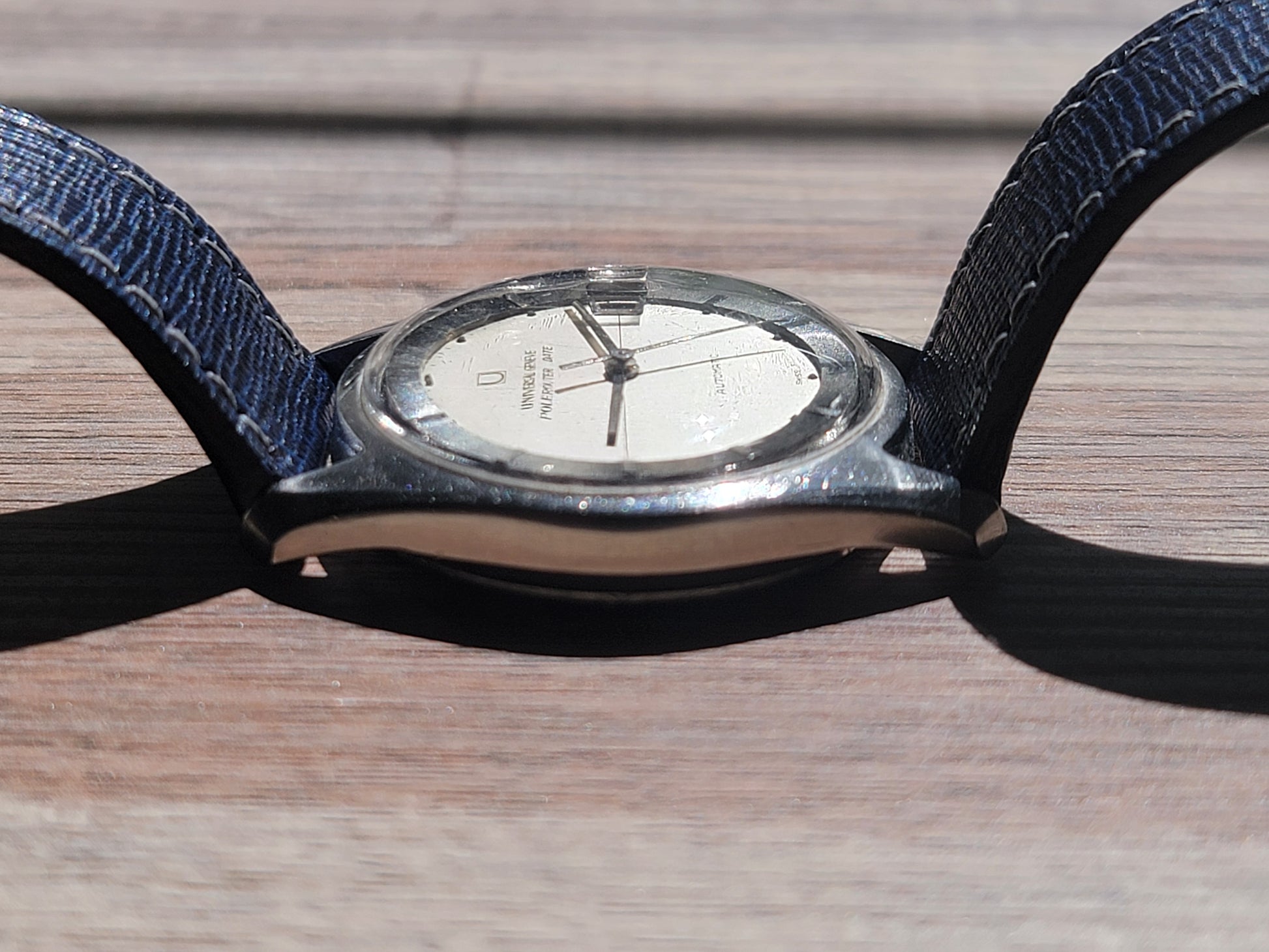 What I like so much about this Polerouter model is it's differences compared to the all too common black dial variant with twisted lugs. I think the silver dial variant is very understated and brings a different sense of elegance and feel to the watch. With the all silver dial, chapter ring, and stainless steel case, the watch presents a monochromatic look which in my opinion allows it to be much more versatile as a daily vintage driver especially with its 35mm case design which wears larger on the wrist then it's dimensions. The monochromatic silver can easily dress up more than it's more tool oriented black dial cousin, but also has the ability to dress down due to it's more robust squared case design and stick hands. One of my favorite features of the watch however, has got to be it's magnified trapezoid date window. There's something about the date wheel font that UG uses that really gives it a special vintage vibe. The UG micro rotor caliber 69 is a beautiful workhorse and such a unique movement to a vintage watch. In my opinion, the UG Polerouter is one of the most balanced and beautiful watches ever created. If your looking for a vintage daily driver that has a classic design, historical relevance, and offers incredible value, you can't beat this vintage UG Polerouter date.