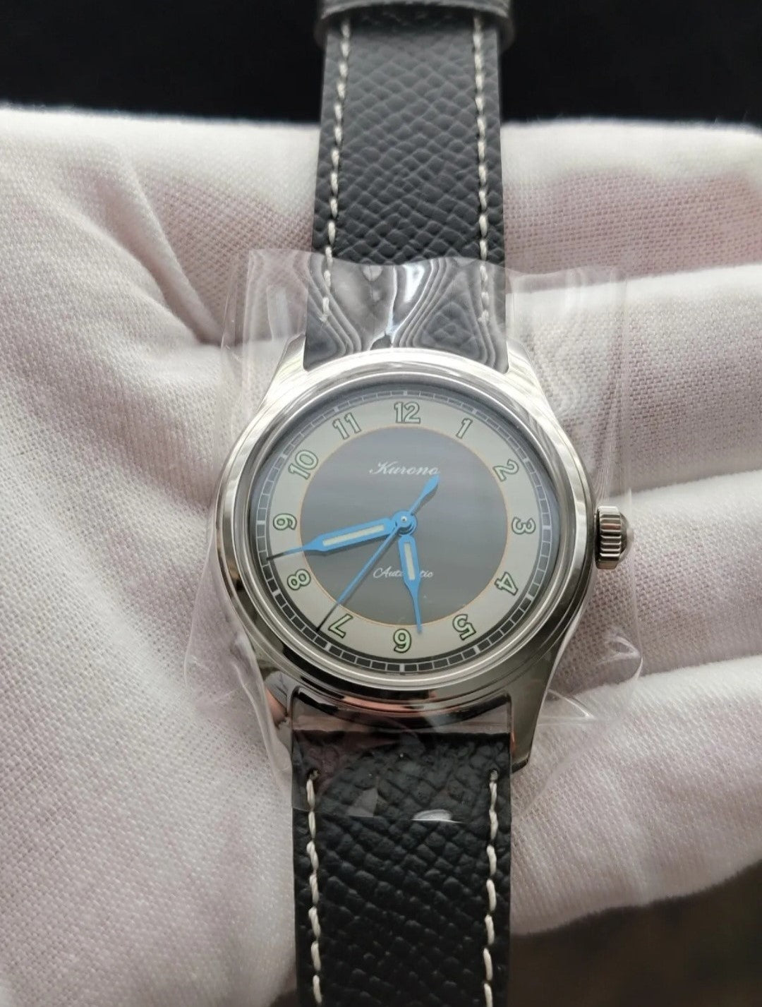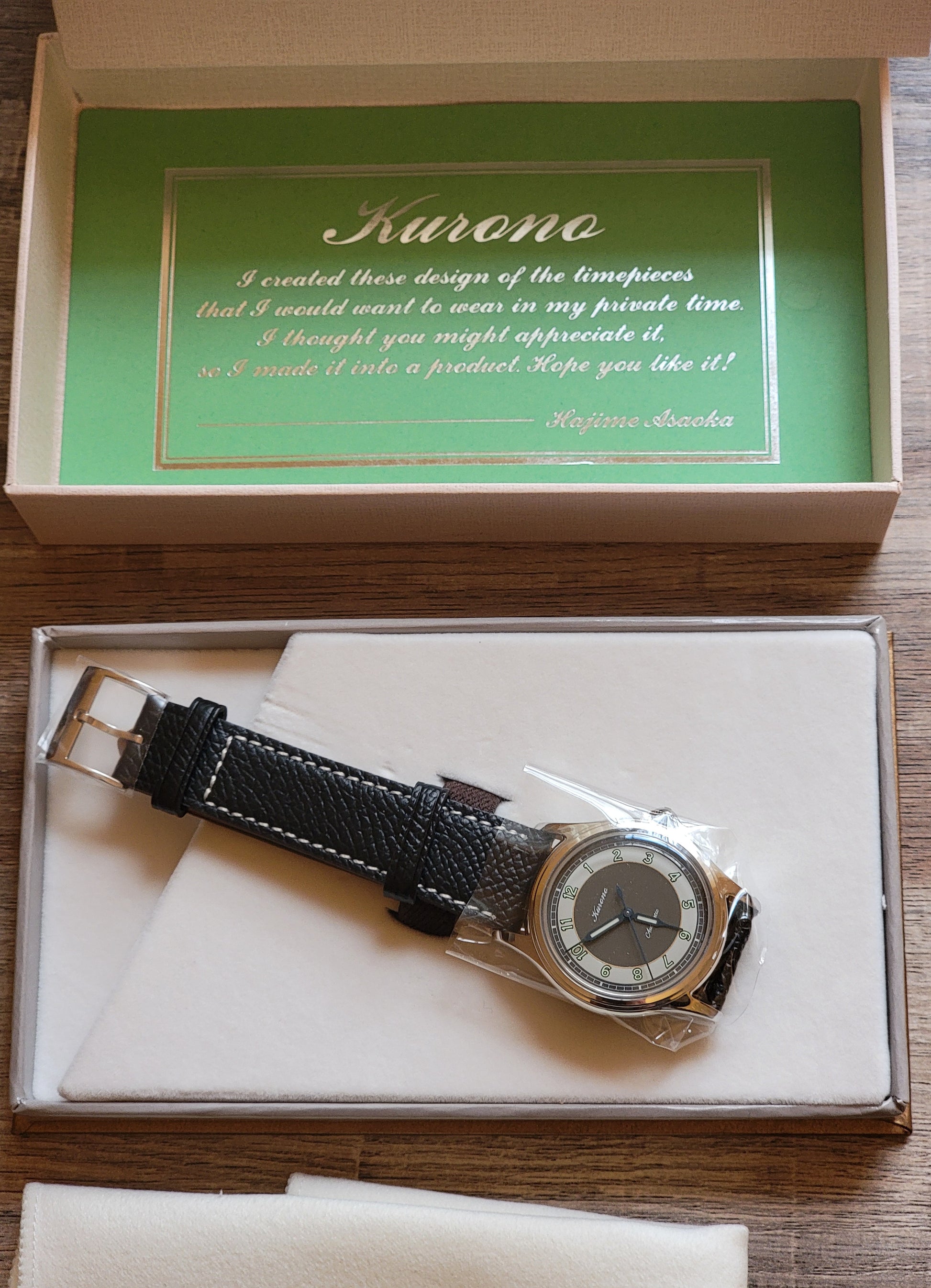 A BNIB limited edition of 150 pieces special projects Kurono Tokyo designed by world renowned watchmaker Hajime Asaoka. Hajime Asaoka is nationally treasured as on of the few living "Gendai no Meiko" master craftsmen in Japan. This very limited and sold out "Dark Mist" model is the second version of the special projects edition. The watch features a wearable 34mm case diameter in stainless steel. It features a push/pull crown offering 50 meters of water resistance. The bullseye designed dial features a gray center with a white hour track and Arabic numerals. The hands are blued and add to the contrast against the dial giving a beautiful elegance tp the watch especially in sunlight. There is generous lume applied to the hands and Arabic hour markers making for easy readability at night. The watch contains a boxed sapphire crystal adding to the vintage aesthetic along with a closed caseback. The movement is a 24 jewel Miyota 90s5 with 40 hours of power reserve. The watch comes in a beautiful packaging with a note from Kurono Tokyo.