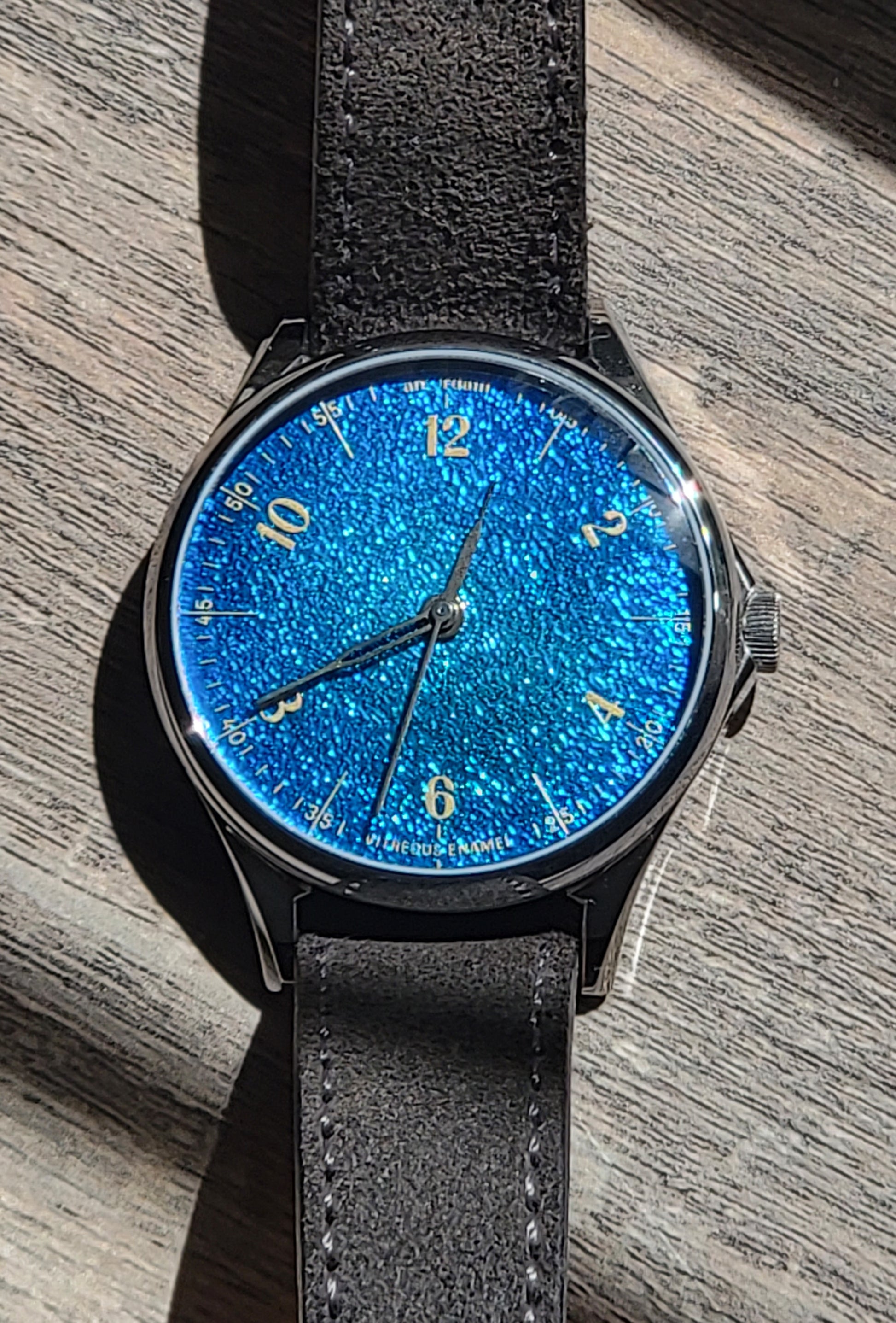 AnOrdain is such a special brand that has been offering amazing enamel dial watches for a fraction of what other manufacturers charge. Outside of Switzerland and Japan, AnOrdain is the only company producing hand enamel dials in house since 2015. With a high rejection rate and several years of master artisans experience required, enamel dials are unique and highly coveted. These enamel dials are developed through painstaking technique's over several years and are limited in how many can be produced each year. The Model 1 Fume dial is the most coveted of AnOrdain's watches and currently has a slot waitlist of over several years. The Model 1 has such a unique vibrant texture and color to its fume enamel dial that it is truly mesmerizing to behold. Out of all the color variants this blue one is one of my favorites. You will find yourself staring and getting lost in this dial as if your gazing out at a vast ocean. This particle watch was only worn a handful of times and is in mint condition with box and papers. With the high demand of these by collectors, this one will not be in the shop for long, so I suggest grabbing it while you can!